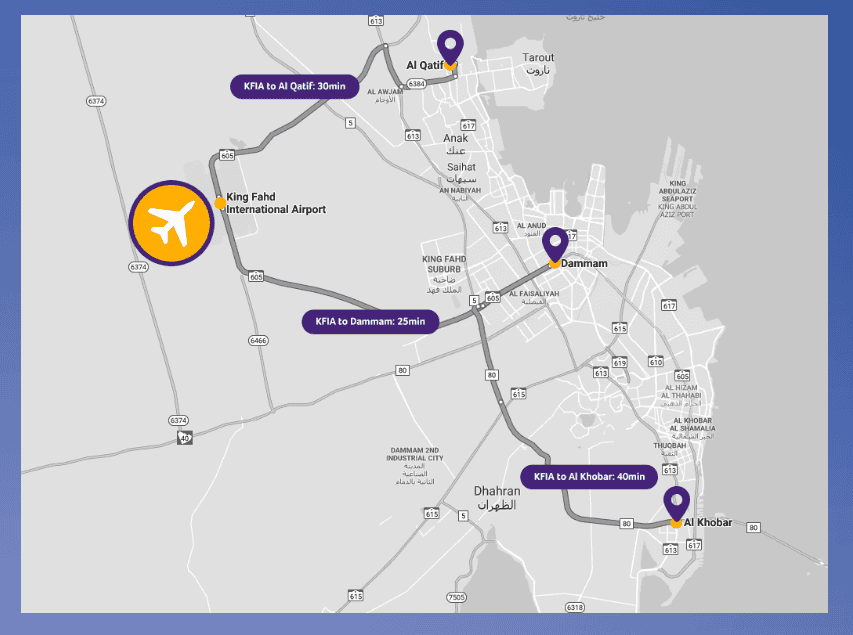 King Fahd International Airport ligger i Dammam, i Saudiarabiens östra provins. Två linjer förbinder flygplatsen med staden. Den södra avfarten, väg 605, förbinder flygplatsen med Dammam som en sexfilig motorväg, medan den norra avfarten förbinder flygplatsen med Qatif som en fyrfilig motorväg.